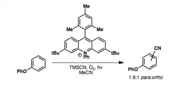 Radical approaches to arene C-H cyanation are known. Photoredox mediators (metallic or organic) are most common:[13][14]