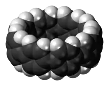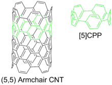 A cycloparaphenylene can be considered as the smallest possible armchair carbon nanotube, and is a type of carbon nanohoop.[2] Cycloparaphenylenes are challenging targets for chemical synthesis due to the ring strain incurred from forcing benzene rings out of planarity.