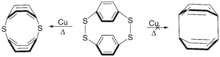 By 1993, Fritz Vögtle attempted to synthesize the less-strained [6]CPP and [8]CPP by the same approach. He produced a hoop of phenyl rings, bridged together by a sulfur atom. However, his attempts to remove the sulfur failed too. They also synthesized a macrocycle that upon dehydrogenation would yield a CPP, but could not perform this final step.[5][4]