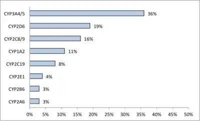 P450s are the major enzymes involved in drug metabolism, accounting for about 75% of the total metabolism.[7] Most drugs undergo deactivation by P450s, either directly or by facilitated excretion from the body. However, many substances are bioactivated by P450s to form their active compounds like the antiplatelet drug clopidogrel and the opiate codeine.