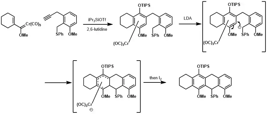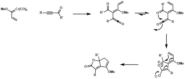 Exposing Fischer carbene with alkenyl side chain to an alkyne gives a highly substituted phenol. The phenolic carbon is originated from the CO ligand. The α,β-unsaturated part could also be from an electron rich aryl system, yielding a polycyclic aromatic system. This reaction was first discovered by Karl Dötz and was extensively developed by his group, thus giving the name Dötz reaction. It is sometimes called Wuff-Dötz reaction because William Wuff's group at Michigan State University also extensively contributed to the development of this reaction.[13]