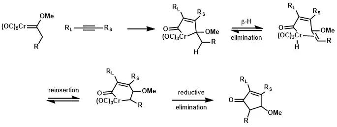 Fischer carbenes with an α-hydrogen could form could give cyclopentenone product similar to Pauson-Khand reaction. This is presumably because of a β-hydride elimination and reinsertion process.[23]