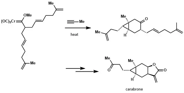 If the alkene moiety is present in Fischer carbene, but not in conjugation, cyclopropanation could be observed. The strategy was employed in a formal synthesis of carabrone.[24][25]