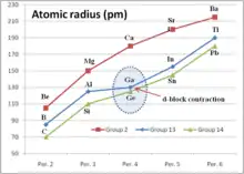 Atomic radius of elements of the groups 2, 13 and 14, showing the "d-block contraction", especially for Ga and Ge