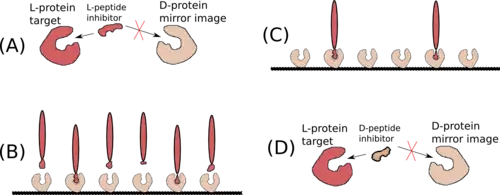 Mirror-image phage display is a similar method that can be used to screen large libraries of D-peptides that bind to target L-proteins. More precisely, since D-peptides can not be expressed in bacteriophages, mirror-image phage display screens L-peptides that bind to immobilized D-proteins that are previously chemically synthesized. Because of the mirror properties of D-peptides, the D-enantiomer of an L-peptide that binds to a D-protein will bind to the L-protein.