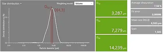 The De Brouckere mean diameter is the mean of a particle size distribution weighted by the volume (also called volume-weighted mean diameter, volume moment mean diameter.[1] or volume-weighted mean size[2]). It is the mean diameter, which is directly obtained in particle size measurements, where the measured signal is proportional to the volume of the particles. The most prominent examples are laser diffraction[3] and acoustic spectroscopy (Coulter counter).