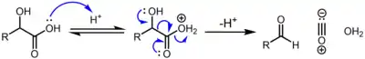 α-Hydroxy acids, e.g. (lactic acid and glycolic acid) undergo decarbonylation when treated with catalytic concentrated sulfuric acid, by the following mechanism:[2]