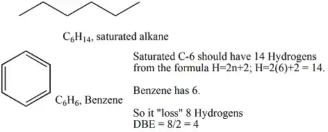 For hydrocarbons, the DBE (or IHD) tells us the number of rings and/or extra bonds in a non-saturated structure, which equals the number of hydrogen pairs that are required to make the structure saturated, simply because joining two elements to form a ring or adding one extra bond (e.g., a single bond changed to a double bond) in a structure reduces the need for two H's. For non-hydrocarbons, the elements in a pair can include any elements in the lithium family and the fluorine family in the periodic table, not necessarily all H's.