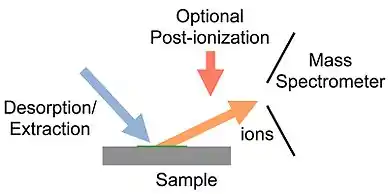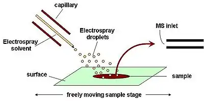 Desorption electrospray ionization (DESI) is an ambient ionization technique that can be coupled to mass spectrometry (MS) for chemical analysis of samples at atmospheric conditions. Coupled ionization sources-MS systems are popular in chemical analysis because the individual capabilities of various sources combined with different MS systems allow for chemical determinations of samples. DESI employs a fast-moving charged solvent stream, at an angle relative to the sample surface, to extract analytes from the surfaces and propel the secondary ions toward the mass analyzer.[1][2] This tandem technique can be used to analyze forensics analyses,[3] pharmaceuticals, plant tissues, fruits, intact biological tissues, enzyme-substrate complexes, metabolites and polymers.[4] Therefore, DESI-MS may be applied in a wide variety of sectors including food and drug administration, pharmaceuticals, environmental monitoring, and biotechnology.