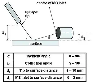 The ionization efficiency of DESI is complex and depends on several parameters such as, surface effects, electrospray parameters, chemical parameters and geometric parameters.[12] Surface effects include chemical composition, temperature and electric potential applied. Electrospray parameters include electrospray voltage, gas and liquid flow rates. Chemical parameters refers to the sprayed solvent composition, e.g. addition of NaCl. Geometric parameters are α, β, d1 and d2 (see figure on the right).