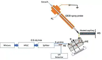 DESI can be coupled to ultra-fast liquid chromatography using an LC eluent splitting strategy. It is a strategy through a tiny orifice on an LC capillary tube. There is negligible dead volume and back pressure that allows for almost real time mass spectrometry detection with a fast elution and purification.[22] This coupling can be used to ionize a wide range of molecules, from small organics to high mass proteins. This is different from ESI (electrospray ionization) in that it can be used to directly analyze salt-containing sample solutions without requiring “make-up” solvents/ acids to be doped into the sample.[23] This set up allows for a high flow rate without splitting. The high resolution that is accomplished by reverse-phase HPLC can be combined with this procedure to produce high throughput screening of natural products as well.[24] The incorporation of the electrochemistry component helps with ionization efficiency via the electrochemical conversion.[25] This method is proved better than ESI in the fact that you don't have to separate the small potential that is applied to the cell from the potential on the spray in DESI. DESI also shows a better tolerance to inorganic salt electrolytes and you can use traditional solvents used in electrolysis.[24]