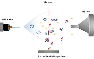 Laser ablation electrospray ionization (LAESI) mass spectrometry is an ambient ionization technique applicable to plant and animal tissue imaging, live-cell imaging, and most recently to cell-by-cell imaging.[14] This technique uses a mid-IR laser to ablate the sample which creates a cloud of neutral molecules. This cloud is then hit with the electrospray from above to cause ionization. The desorbed ions are then able to pass into the mass spectrometer for analysis. This method is also good for imaging in applications. The analyses can be desorbed through a pulsed laser irradiation without the need of a matrix. This method is best used with small organic molecules up to larger biomolecules as well.[15]
