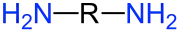 General structure of (primary) diamines. The primary amino groups (NH2) are marked blue, R is a divalent organic radical (e.g. a para-phenylene group). |