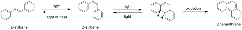 After the 6π electrocyclization of the Z form to the "close-ring" form, most unsubstituted diarylethenes are prone to oxidation, leading to a re-aromatization of the π-system. The most common example is (E)-stilbene, which upon irradiation undergoes an E to Z isomerization, which can be followed by a 6π electrocyclization. Reaction of the product of this reaction with molecular oxygen affords phenanthrene, and it has been suggested by some studies that dehydrogenation may even occur spontaneously. The dihydrophenanthrene intermediate has never been isolated, but it has been detected spectroscopically in pump-probe experiments by virtue of its long wavelength optical absorption band. Although both the E-Z isomerization and the 6π electrocyclization are reversible processes, this oxidation renders the entire sequence irreversible.[2]