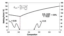 Figure 1: Melting point phase diagram (using the Schroeder – van Laar Equation) of a prototypical diastereomeric system. nb. utility in a solvent mediated crystallization implicitly assumes ideal behaviour (in that changing the solvent will not change the composition of the binary eutectic). In this example, assuming a racemate (50:50 mix of enantiomers), then with a eutectic of 0.23, the maximum yield we can expect from system, via crystallization, is 35%.