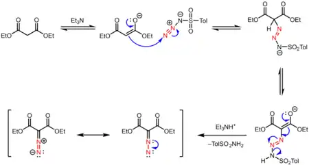 The mechanism involves attack of the enolate at the terminal nitrogen, proton transfer, and expulsion of the anion of the sulfonamide. Use of the β-carbonyl aldehyde leads to a deformylative variant of the Regitz transfer, which is useful for the preparation of diazo compounds stabilized by only one carbonyl group.[13]