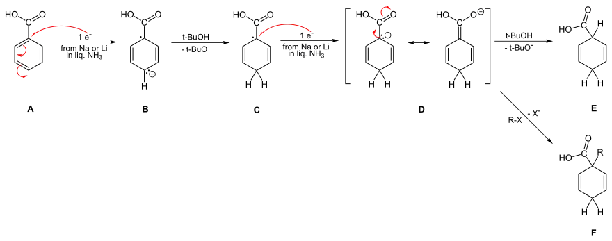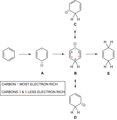 The reaction is known to be third order – first order in the aromatic, first order in the alkali metal, and first order in the alcohol.[4] This requires that the rate-limiting step be the conversion of radical anion B to the cyclohexadienyl radical C.