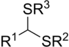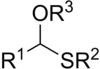 In organosulfur chemistry, thioacetals are the sulfur (thio-) analogues of acetals (R−CH(−OR)2). There are two classes: the less-common monothioacetals, with the formula R−CH(−OR')−SR", and the dithioacetals, with the formula R−CH(−SR')2 (symmetric dithioacetals) or R−CH(−SR')−SR" (asymmetric dithioacetals).[1]
