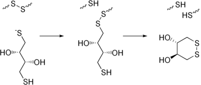 A common 1,4-dithiol is dithiothreitol (DTT), HSCH2CH(OH)CH(OH)CH2SH, sometimes called Cleland's reagent, for to reduce protein disulfide bonds. Oxidation of DTT results a stable six-membered heterocyclic ring with an internal disulfide bond.