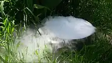 At least one person has been killed by carbon dioxide gas subliming off dry ice in coolers placed in a car.[51] In 2020, three people were killed at a party in Moscow after 25 kg of dry ice was dumped in a pool; carbon dioxide is heavier than air, and so can linger near the ground, just above water level.[52]