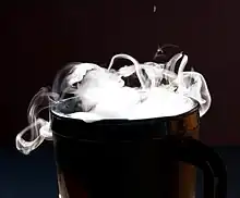 When dry ice is placed in water, sublimation is accelerated, and low-sinking, dense clouds of smoke-like fog are created. This is used in fog machines, at theatres, haunted house attractions, and nightclubs for dramatic effects. Unlike most artificial fog machines, in which fog rises like smoke, fog from dry ice hovers near the ground.[14] Dry ice is useful in theatre productions that require dense fog effects.[22] The fog originates from the bulk water into which the dry ice is placed, and not from atmospheric water vapor (as is commonly assumed).[23]
