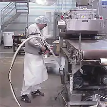 Dry-ice blasting can be used to clean food processing equipment.[9] As early as 2004, the UK Food Standards Agency documented the process to effectively decontaminate surfaces of Salmonella enteritidis, E. coli, and Listeria monocytogenes such that these microorganisms are not detectable using conventional microbiological methods.[10] "As a result of two outbreaks salmonellosis associated with the consumption of peanut butter and baby food in 2006–2007,[11][12] an effort was taken" by GMA members such as Cargill "to reassess industry practices for eliminating salmonella in low-moisture products" because "Salmonella outbreaks from low-moisture products are relatively rare but often impact large numbers of people." A document resulted from this effort describing a variety of waterless cleaning methods,[13] including dry-ice blasting.