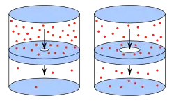 In physics and chemistry, effusion is the process in which a gas escapes from a container through a hole of diameter considerably smaller than the mean free path of the molecules.[1] Such a hole is often described as a pinhole and the escape of the gas is due to the pressure difference between the container and the exterior. Under these conditions, essentially all molecules which arrive at the hole continue and pass through the hole, since collisions between molecules in the region of the hole are negligible. Conversely, when the diameter is larger than the mean free path of the gas, flow obeys the Sampson flow law.
