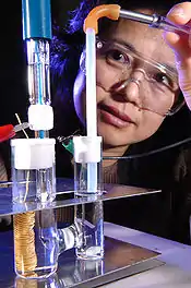 An electrocatalyst is a catalyst that participates in electrochemical reactions. Electrocatalysts are a specific form of catalysts that function at electrode surfaces or, most commonly, may be the electrode surface itself. An electrocatalyst can be heterogeneous such as a platinized electrode.[1] Homogeneous electrocatalysts, which are soluble, assist in transferring electrons between the electrode and reactants, and/or facilitate an intermediate chemical transformation described by an overall half reaction.[2] Major challenges in electrocatalysts focus on fuel cells.[3][4]