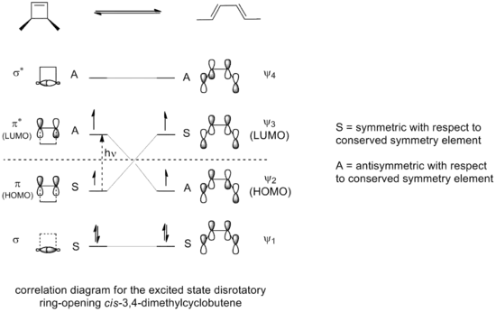 If the ring opening of 3,4-dimethylcyclobutene were carried out under photochemical conditions the resulting electrocyclization would be occur through a disrotatory mode instead of a conrotatory mode as can be seen by the correlation diagram for the allowed excited state ring opening reaction.