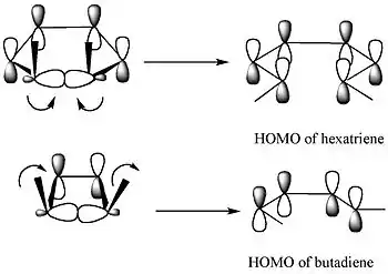 This reaction course can be explained in a simple analysis through the frontier-orbital method: the sigma bond in the reactant will open in such a way that the resulting p-orbitals will have the same symmetry as the HOMO of the product (a hexadiene). The only way to accomplish this is through a conrotatory ring-opening which results in opposite phases for the terminal lobes.