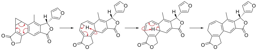 The benzonorcaradiene diterpenoid (below left) was rearranged into the benzocycloheptatriene diterpenoid isosalvipuberlin (right) by boiling a methylene chloride solution. This transformation can be envisaged as a disrotatory electrocyclic reaction, followed by two suprafacial 1,5-sigmatropic hydrogen shifts, as shown below.[6]