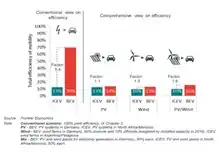 Frontier Economics found in its 2020 study that by using favorable locations with very high potential for renewable energy, internal combustion engine vehicles can achieve similar efficiency to battery electric vehicles. This similar efficiency is ensured by increased electricity production in favorable locations, which is harnessed through power-to-fuel applications. According to these study results, the efficiency ratio is not 5-7 but rather a manageable 1.6 (e.g., the figure "total efficiency of mobility").[18]