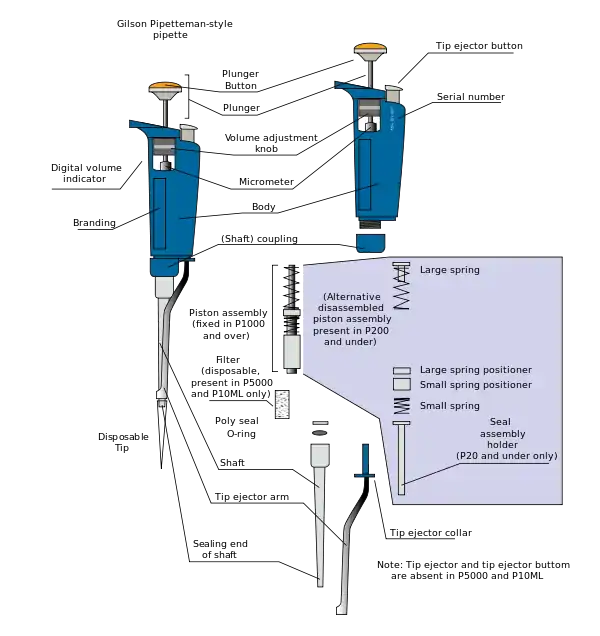 Micropipettes can take a minimum volume of 0.2 μL and maximum volume of 10,000 μL (10 mL).[2][3] They thus are used for smaller-scale transfers than equipment such as graduated pipettes, which come in 5, 10, 25 and 50 mL volumes.