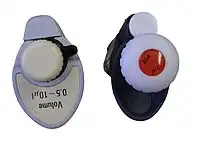 Some air displacement pipettes can additionally feature a locking mechanism (referred to as "locking pipettes") to allow better changing of volume yet preserving accuracy. By locking the set volume while performing several identical pipetting actions, accidental changes to the pipette volume setting are avoided. The lock mechanism is typically a mechanical toggle close to the pipette setting controls that interferes with the setting mechanism to prevent movement. Some pipettes, however, feature dials for setting the individual volume digits that can only be adjusted when unlocked by depressing and twisting the plunger.[9]