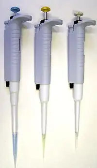 Piston-driven air displacement pipettes are a type of micropipette, which are tools to handle volumes of liquid in the microliter scale. They are more commonly used in biology and biochemistry, and less commonly in chemistry; the equipment is susceptible to damage from many organic solvents.