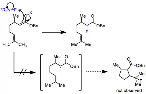 On the other hand, the lifetime of radicals in the SET process is predicted to be four orders of magnitude shorter than the detection limit of even the most sensitive of radical probes. It has been postulated that after electron transfer, immediate recombination of the fluorine radical with the alkyl radical takes place.[5]