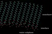 The specific mechanism that underlies monolayer evaporation resistance has been attributed to the physical barrier formed by the presence of these materials on the surface of the water (see figure).[1] The extent to which a material can resist the evaporation of water is best treated on a case-by-case basis, however, a number of empirically derived formulas have been reported. Before the advent of surface spectroscopic techniques such as Brewster Angle Microscopy (BAM) and Glancing Incidence X-Ray reflectrometry (GIXD), it was thought that the intermolecular spacing between monolayer molecules was the largest determinant factor governing evaporation suppression. When the surface density of the monolayer was sufficiently small, water molecules were presumed to pass through the space between molecules.[2][3][4][5] Scattering and imaging results, however, revealed that the intermolecular distance between monolayer molecules was essentially constant, and that evaporation was more likely at domain boundaries.[6] The factors governing the efficacy of an evaporation suppressing monolayer are the ability to remain tightly packed despite changes in surface pressure, the ability to adhere to the surface of water, and to neighbouring molecules.[7]
