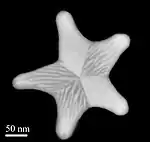 Dating back to the nineteenth century there are reports of these particles by authors such as Jacques-Louis Bournon in 1813 for marcasite,[9][10] and Gustav Rose in 1831 for gold.[6] In mineralogy and the crystal twinning literature they are referred to as a type of cyclic twin where a number of identical single crystal units are arranged in a ring-like pattern where they all join at a common point or line.[11] The name fiveling comes from them having five members (single crystals).[12] The older literature was mainly observational, with information on many materials documented by Victor Mordechai Goldschmidt in his Atlas der Kristallformen.[13] Drawings are available showing their presence in marcasite, gold, silver, copper and diamond. New mineral forms with a fiveling structure continue to be found, for instance pentagonite, whose structure was first decoded in 1973, is named because it is often found with the five-fold twinning.[2][14]