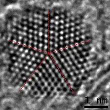 Most modern analysis started with the observation of these particles by Shozo Ino and Shiro Ogawa in 1966-67,[15][16] and independently but slightly later (which they acknowledged) work by John Allpress and John Veysey Sanders.[17] In both cases these were for vacuum deposition of metal onto substrates in very clean (ultra-high vacuum) conditions, where nanoparticle islands of size 10-50 nm were formed during thin film growth. Using transmission electron microscopy and diffraction these authors demonstrated the presence of the five single crystal units in the particles, and also the twin relationships. They also observed single crystals and a related type of icosahedral nanoparticle. They called the five-fold and icosahedral crystals multiply twinned particles (MTPs). In the early work near perfect decahedron (pentagonal bipyramid) and icosahedron shapes were formed, so they were called decahedral MTPs or icosahedral MTPs, the names connecting to the decahedral () and icosahedral () point group symmetries.[lower-alpha 3] Parallel, and apparently independent there was work on larger metal whiskers (nanowires) which sometimes showed a very similar five-fold structure,[18][19] an occurrence reported in 1877 by Gerhard vom Rath.[20] There was fairly extensive analysis following this, particularly for the nanoparticles, both of their internal structure by some of the first electron microscopes that could image at the atomic scale,[21] and by various continuum or atomic models as cited later.