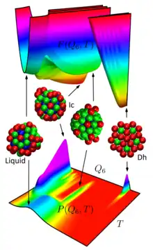 For systems where icosahedral and decahedral morphologies are both relatively low in energy, the competition between these structures has implications for structure prediction and for the global thermodynamic and kinetic properties. These result from a double funnel energy landscape[98][99] where the two families of structures are separated by a relatively high energy barrier at the temperature where they are in thermodynamic equilibrium. This situation arises for a cluster of 75 atoms with the Lennard-Jones potential, where the global potential energy minimum is decahedral, and structures based upon incomplete Mackay icosahedra[100] are also low in potential energy, but higher in entropy. The free energy barrier between these families is large compared to the available thermal energy at the temperature where they are in equilibrium. An example is shown in the figure, with probability in the lower part and energy above with axes of an order parameter and temperature . At low temperature the 75 atom decahedral cluster (Dh) is the global free energy minimum, but as the temperature increases the higher entropy of the competing structures based on incomplete icosahedra (Ic) causes the finite system analogue of a first-order phase transition; at even higher temperatures a liquid-like state is favored.[25]