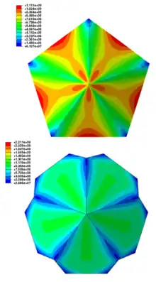 More recently there has been detailed analysis of the atomic positions first by Craig Johnson et al,[56] followed up by a number of other authors,[57][58][59] providing more information on the strains and showing how they are distributed in the particles. While the classic disclination strain field is a reasonable first approximation model, there are differences when more complete elastic models are used such as finite element methods, particularly as pointed out by Johnson et al, anisotropic elasticity needs to be used.[56][60][59] One further complication is that the strain field is three dimensional, and more complex approaches are needed to measure the full details as detailed by Bart Goris et al, who also mention issues with strain from the support film.[61] In addition, as pointed out by Srikanth Patala, Monica Olvera de la Cruz and Marks[50] and shown in the figure, the Von Mises stress are different for (kinetic growth) pentagonal bipyramids versus the minimum energy shape.[50] As of 2024 the strains are consistent with finite element calculations and a disclination strain field, with the possible addition of a shear component at the twin boundaries to accommodate some of the strains.[56][58][59]