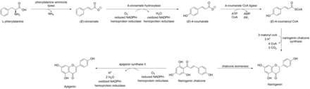The biosynthesis of flavones proceeds from the phenylpropanoid pathway, which uses L-phenylalanine as a starting point.[6] Phenylalanine ammonia lyase facilitates the deamination of L-phenylalanine to (E)-cinnamate,[6] which is then oxidized by cinnamate 4-hydroxylase to yield p-Coumaric acid.[7] Coenzyme A is attached to the carboxylate facilitated by 4-Coumarate-CoA ligase, forming (Coumaroyl-CoA).[6] A chalcone synthase then facilitates a series of condensation reactions in the presence of 3 malonyl CoA ending with a ring-forming Claisen condensation yielding a chalcone (naringenin chalcone is shown), [8] which is subsequently isomerized by chalcone isomerase resulting in a flavanone (naringenin is shown).[9] It is at this point that the flavanone can undergo further modifications (such as glycosylation or methylation at the various points of the backbone. The subsequent modified flavanones are then transformed into flavones by flavone synthase, which generates a double bond between the C-2 and C-3 positions (the synthesis of apigenin is shown).[10]