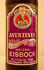 Eisbock beer (12% alcohol) created via freeze distillation of doppelbock beer. Barrels of beer were originally left outdoors to partially freeze, then the ice removed.