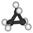 Cyclopropane is the cycloalkane with the molecular formula (CH2)3, consisting of three methylene groups (CH2) linked to each other to form a triangular ring. The small size of the ring creates substantial ring strain in the structure. Cyclopropane itself is mainly of theoretical interest but many of its derivatives - cyclopropanes - are of commercial or biological significance.[3]