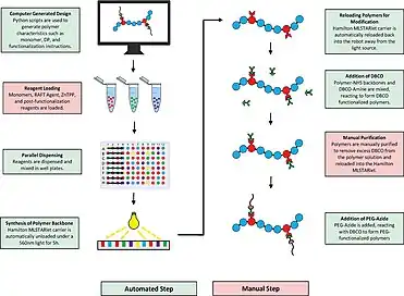While juxtaposed against free-radical polymerization, the application of automated synthesis can be utilized for controlled radical polymerization too. These methods have been used within reversible addition-fragmentation transfer (RAFT), atom-transfer radical (ATRP), and nitroxide-mediated polymerizations, demonstrating the ability of robots to improve efficiency and reduce the hardship of performing reactions.[13] For example, with the automatic dispensation of reagents, Symyx Technologies Inc. was able to polymerize styrene and butyl acrylate through ATRP.[13] In addition, this functionality was supported by Zhang et al. within their research, finding that reproducibility and comparability were equivalent to classical ATRP.[18]