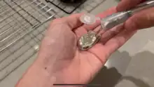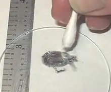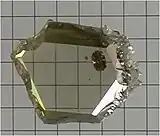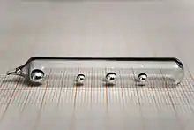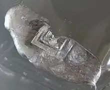 The melting point of gallium allows it to melt in the human hand, and then solidify if removed. The liquid metal has a strong tendency to supercool below its melting point/freezing point: Ga nanoparticles can be kept in the liquid state below 90 K.[20] Seeding with a crystal helps to initiate freezing. Gallium is one of the four non-radioactive metals (with caesium, rubidium, and mercury) that are known to be liquid at, or near, normal room temperature. Of the four, gallium is the only one that is neither highly reactive (as are rubidium and caesium) nor highly toxic (as is mercury) and can, therefore, be used in metal-in-glass high-temperature thermometers. It is also notable for having one of the largest liquid ranges for a metal, and for having (unlike mercury) a low vapor pressure at high temperatures. Gallium's boiling point, 2676 K, is nearly nine times higher than its melting point on the absolute scale, the greatest ratio between melting point and boiling point of any element.[21] Unlike mercury, liquid gallium metal wets glass and skin, along with most other materials (with the exceptions of quartz, graphite, gallium(III) oxide[22] and PTFE),[23] making it mechanically more difficult to handle even though it is substantially less toxic and requires far fewer precautions than mercury. Gallium painted onto glass is a brilliant mirror.[23] For this reason as well as the metal contamination and freezing-expansion problems, samples of gallium metal are usually supplied in polyethylene packets within other containers.