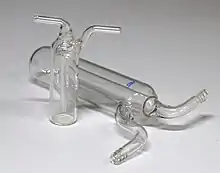 A gas bubbler is a piece of laboratory glassware which consists of a glass bulb filled with a small amount of fluid—usually mineral or silicone oil, less commonly mercury. The inlet to the bulb is connected to a ground glass joint, while the outlet is vented to the air.