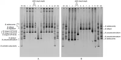 TTGE profiles representing the bifidobacterial diversity of fecal samples from two healthy volunteers (A and B) before and after AMC (Oral Amoxicillin-Clavulanic Acid) treatment