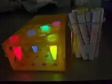 Glowmatography[1] is a laboratory technique for the separation of dyes present in solutions contained in glow sticks. The chemical components of such solutions can be chromatographically separated into polar and nonpolar components. Developed as a laboratory class experiment, it can be used to demonstrate chemistry concepts of polarity, chemical kinetics, and chemiluminescence.[2]