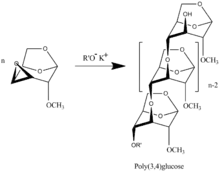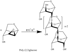 The first representatives of main chain unhydrolysable linear polymers made up of levoglucosan units were synthesized in 1985 by anionic polymerization of 2,3-epoxy derivatives of levoglucosan (1,6;2,3-dianhydro-4-O-alkyl-β-D-mannopyranoses).[3]